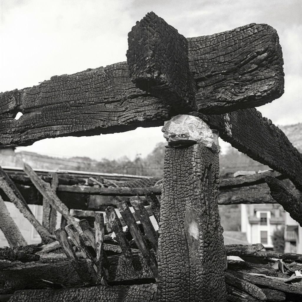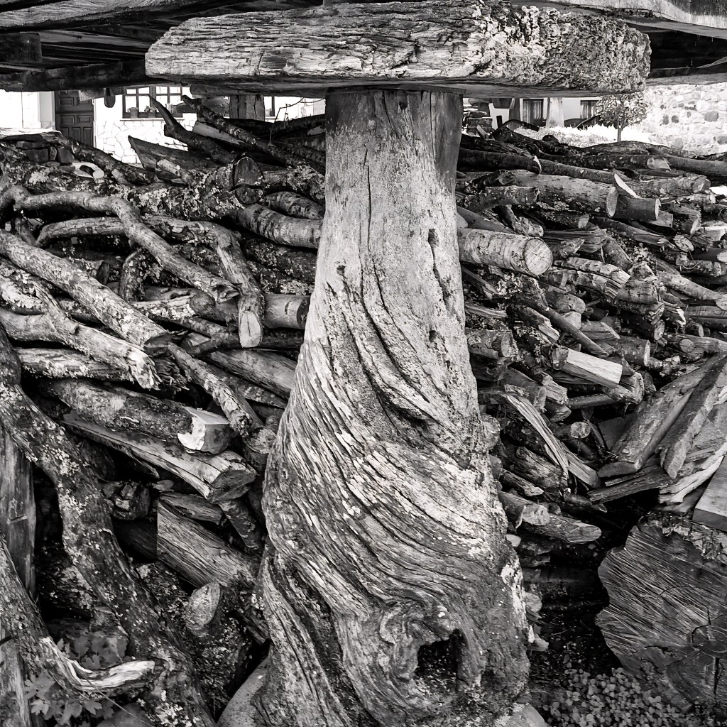 Las fotografías reunidas en esta exposición revelan esa sabiduría silenciosa. No se limitan a documentar estructuras sino que buscan comprenderlas. Cada imagen se acerca a un aspecto distinto de esta arquitectura ancestral, la relación con los animales que la rodean, la torsión de la madera que la sostiene, la huella del fuego que la amenaza, la geometría de sus cubiertas, la precisión de sus tornarratos, la vida que se acumula bajo ellos, el vacío que impide el paso de los roedores, la convivencia con iglesias, casas y paisajes.